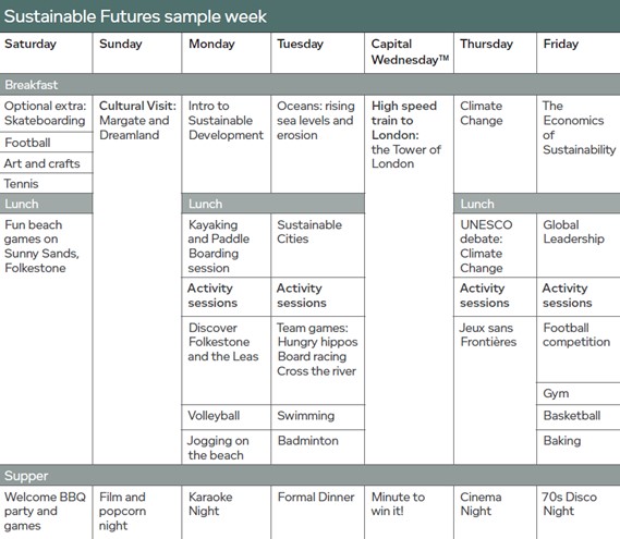 Program obejmuje również dwie całodzienne wycieczki. W każdą środę organizowana jest wycieczka do Londynu, gdzie uczniowie mogą zobaczyć takie obiekty jak Tate Modern, Chelsey Football Club, the London Eye, the British Museum, St Paul’s Cathedral, czy słynny Buckingham Palace. W niedziele organizowane są wycieczki do Canterbury, Leeds Castle, Heveri Castle oraz Royal Tunbridge Wells, Dover Castle lub Thorpe Park Amusement Park. Wszystkie bilety wstępów zawarte są w cenie obozu.