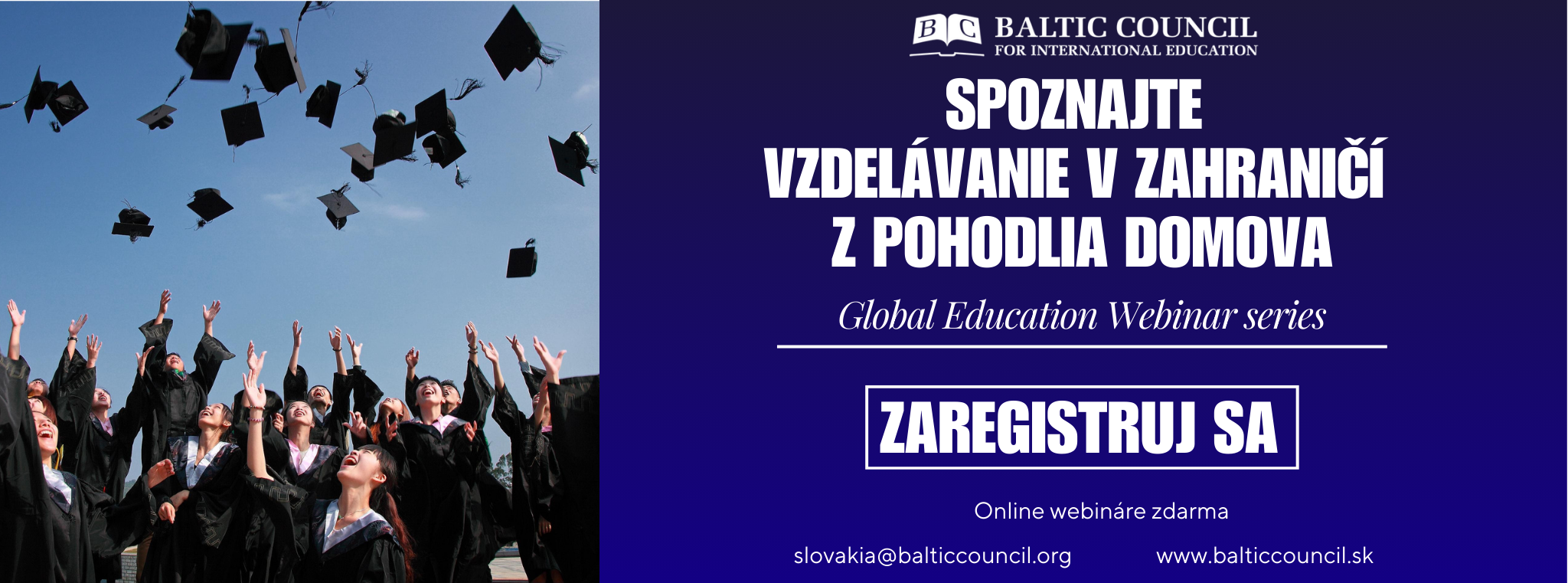 Spoznajte prestížne inštitúcie poskytujúce to najkvalitnejšie vzdelanie po celom svete z pohodlia domova. Okrem zaujímavých prednášok vás čaká možnosť klásť predstaviteľom otázky, a tak zistiť presne to, čo vás zaujíma. Veríme, že tieto webináre vám pomôžu získať viac informácií o možnostiach, ktoré vzdelávanie v zahraničí poskytuje a tak lepšie naštartovať svoju cestu za úspechom.