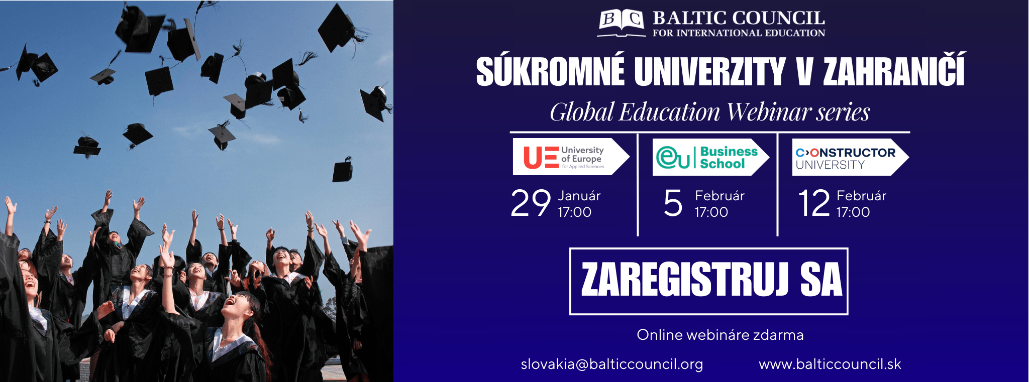 Z pohodlia domova budete mať možnosť spoznať prestížne inštitúcie poskytujúce to najkvalitnejšie vzdelanie po celom svete. Okrem zaujímavých prednášok vás čaká možnosť klásť predstaviteľom otázky, a tak zistiť presne to, čo vás zaujíma. Veríme, že tieto webináre vám pomôžu získať viac informácií o možnostiach, ktoré vzdelávanie v zahraničí poskytuje a tak lepšie naštartovať svoju cestu za úspechom.